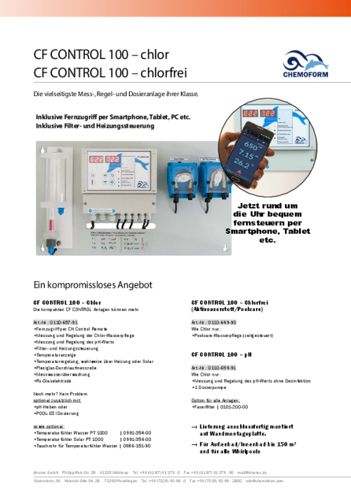Für die verschleißfreie Redoxelektrode ist keine Kalibrierung notwendig (wartungsfrei). Die CF Control 100 erlaubt je nach Ausführung die Desinfektion mit Chlor oder Poolcare. Die Dosierung erfolgt über dazugehörige externe Pumpen.