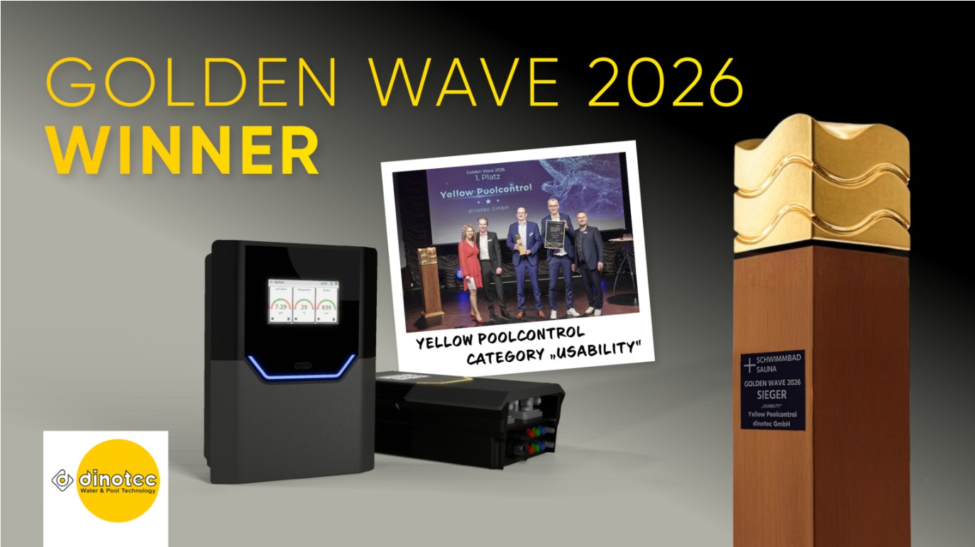 Unser Yellow Poolcontrol wurde mit dem renommierten Golden Wave Award 2026 in der Kategorie Usability ausgezeichnet. Der Innovationspreis wird vom Fachmagazin SCHWIMMBAD+SAUNA verliehen und zählt zu den wichtigsten Auszeichnungen der Pool- und Wellnessbranche im deutschsprachigen Raum.