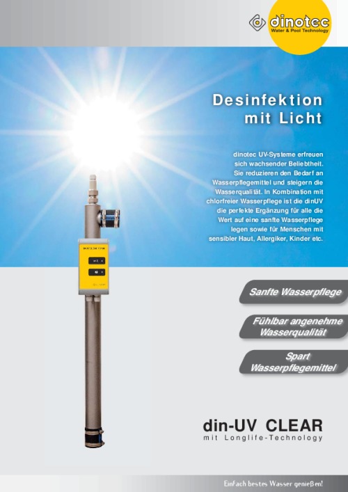 Desinfektion und Abbau von gebundenem Chlor im Schwimmbad und Whirlpool. Mit einer dinUV - Desinfektionsanlage lässt sich der Einsatz von Chemikalien im Schwimmbad oder Whirlpool spürbar reduzieren. Durch die zusätzliche Desinfektionskraft der dinUV-Anlage wird im Becken eine geringere Depotwirkung des ausgewählten Desinfektionsmittels (Chlor, Poolcare usw.) benötigt. Außerdem wird durch den Einsatz der Anlage unerwünschter Schwimmbad-Chlorgeruch (Chloramine) abgebaut.
