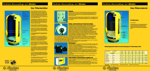 dinotec Gross-Filterbehälter aus glasfaserverstärktem Polyesterharz (GFK) nach DIN 19605 und 19643 hergestellt in präziser Kreuz-Wickel-Technologie mit innerer Polyester- oder Vinyl-Vollauskleidung, langzeitgetempert. Die Produktion der Behälter erfolgt nach dem AD-Merkblatt N 1 und verfügt über KSW/KTW - Prüfzeugnis. Die Serie FiberDOME rundet das dinotec -Behälterprogramm ab. Derzeit werden Filterbehälter bis zu einem Ø von 2600 mm produziert. Die Behälter sind auch in geteilter Ausführung lieferbar - Endmontage durch Fachpersonal vor Ort.