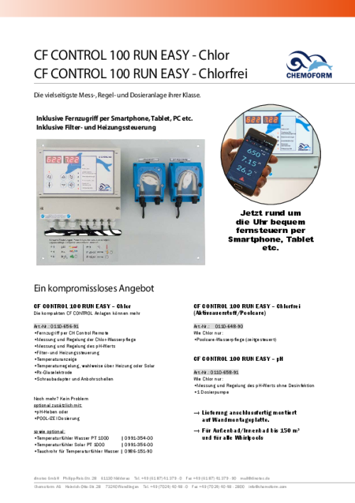 Für die verschleißfreie Redoxelektrode ist keine Kalibrierung notwendig (wartungsfrei). Die CF Control 100 erlaubt je nach Ausführung die Desinfektion mit Chlor oder Poolcare. Die Dosierung erfolgt über dazugehörige externe Pumpen.